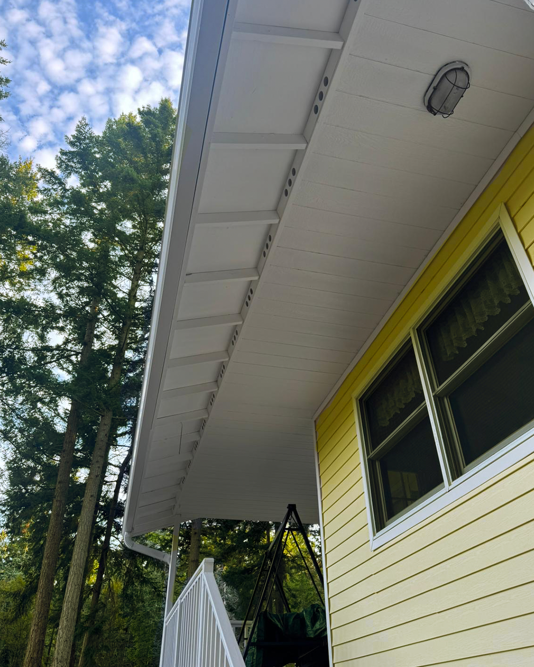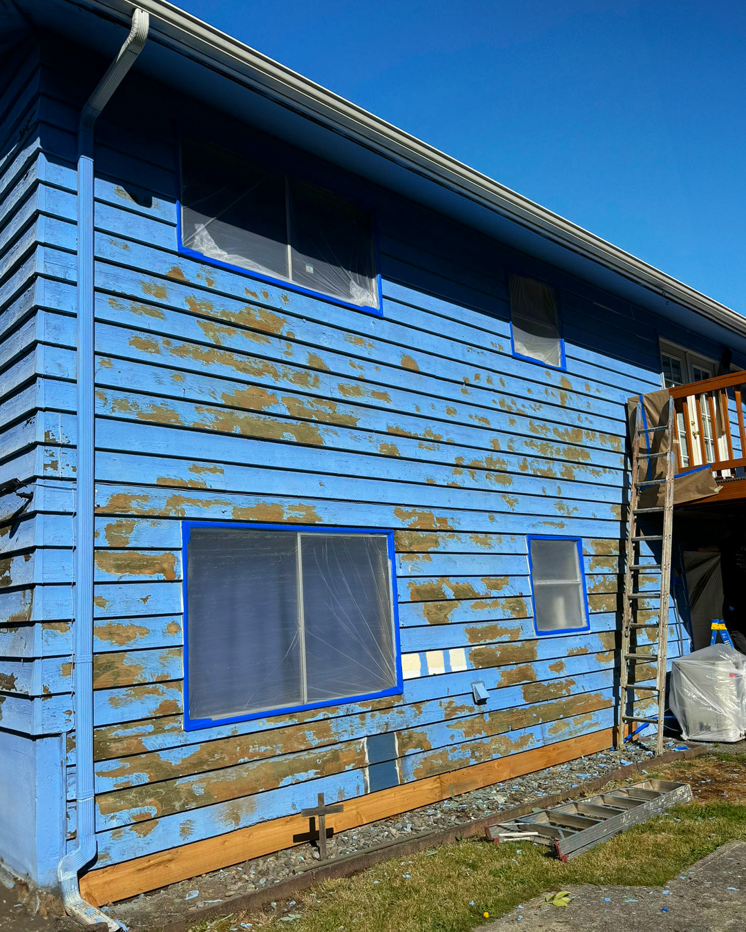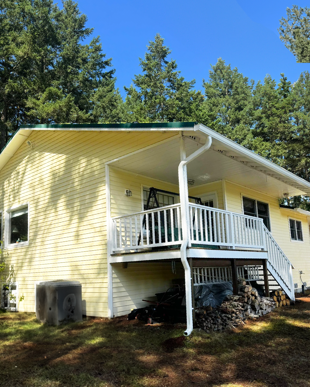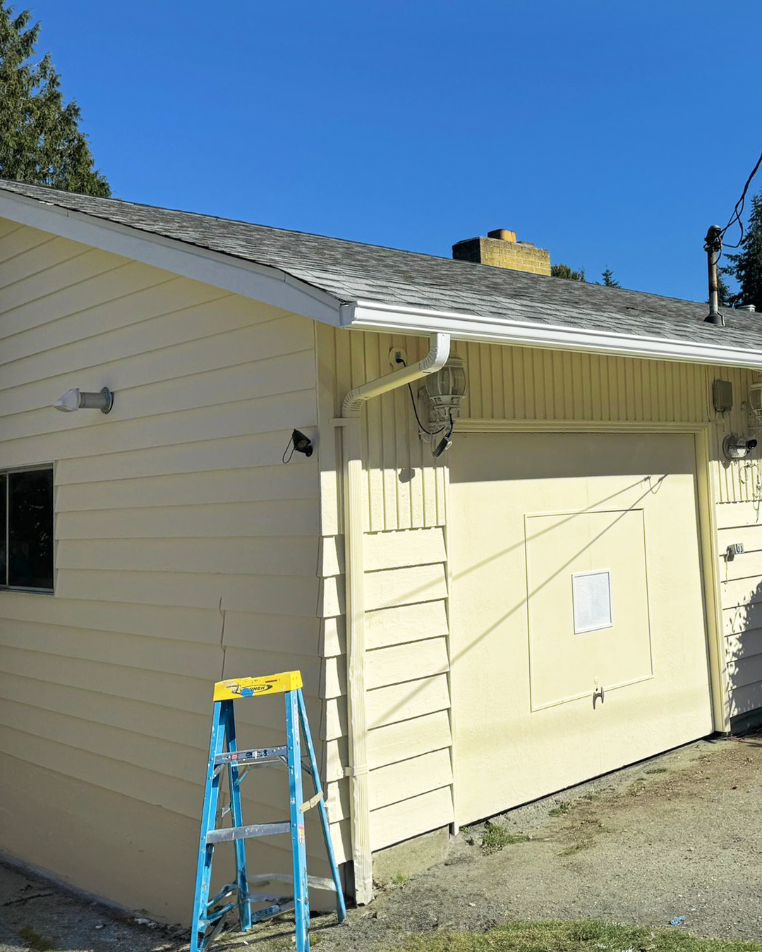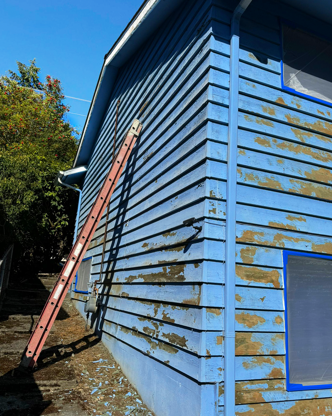 Radiant exterior transformation that turns a peeling blue façade into a luminous champagne yellow, with meticulous preparation, removal of old paint, and premium layers applied over siding, deck, and white gutters. From a deteriorated state to an impeccable, uniform, and protected surface, the house now shines with freshness, warmth, and lasting resilience under the sun. Before-and-after that demonstrate quality and commitment.