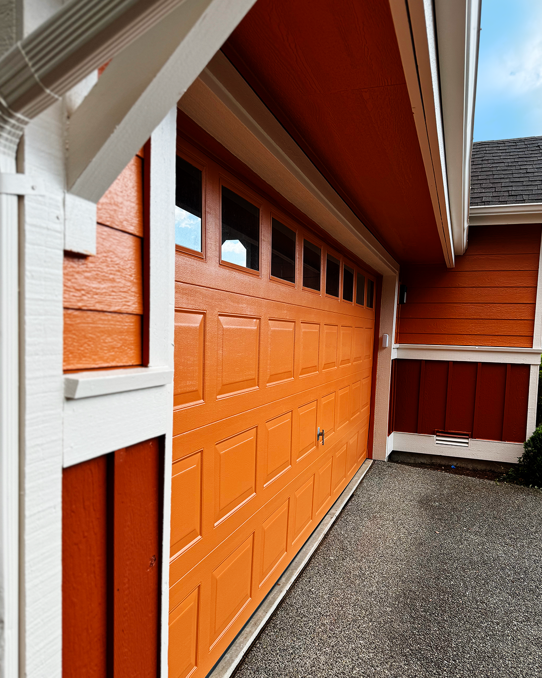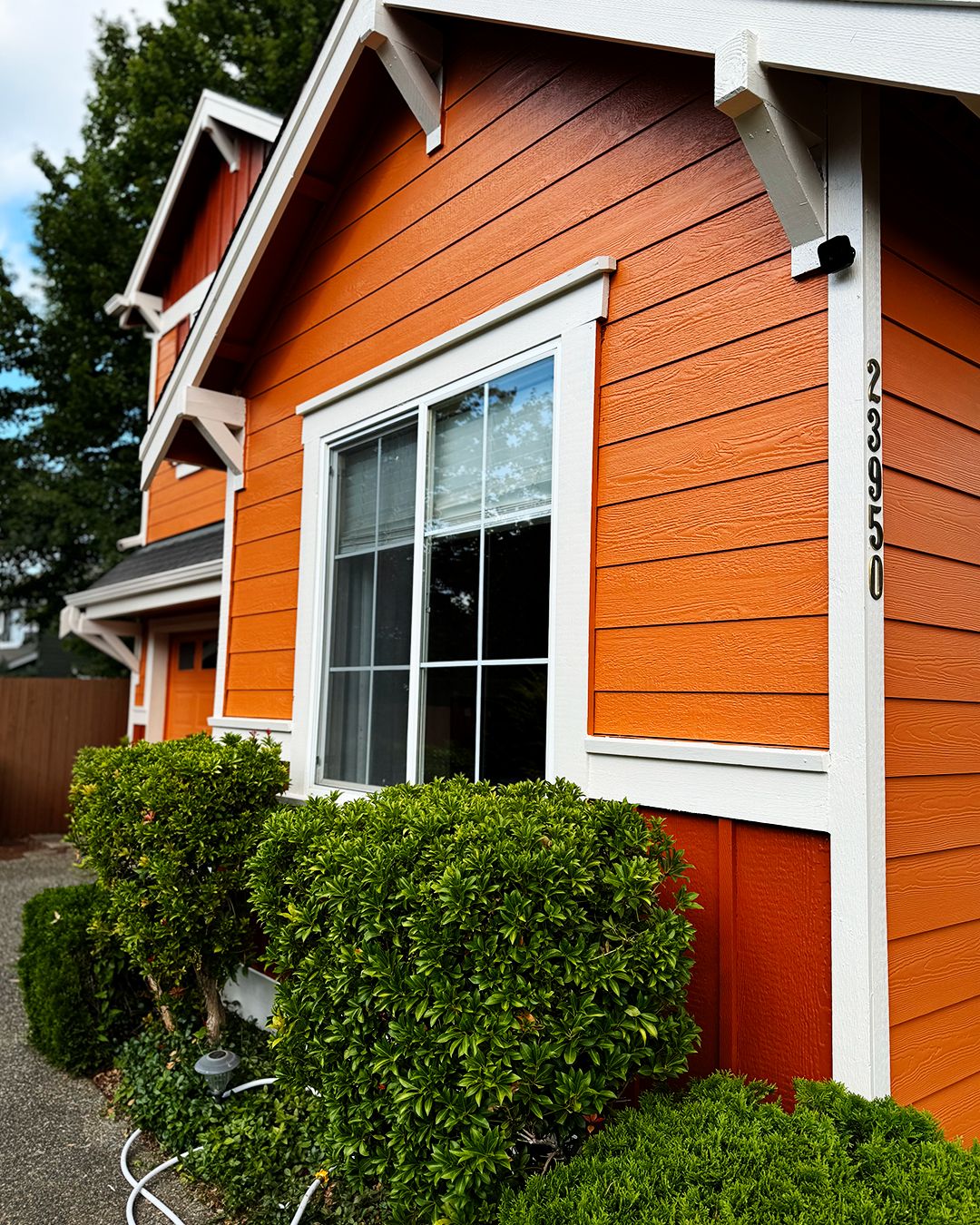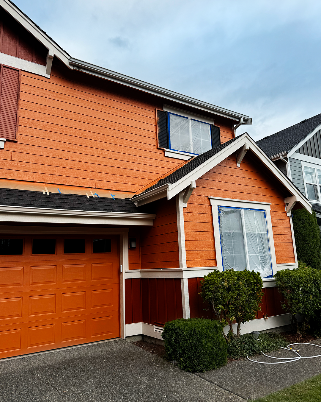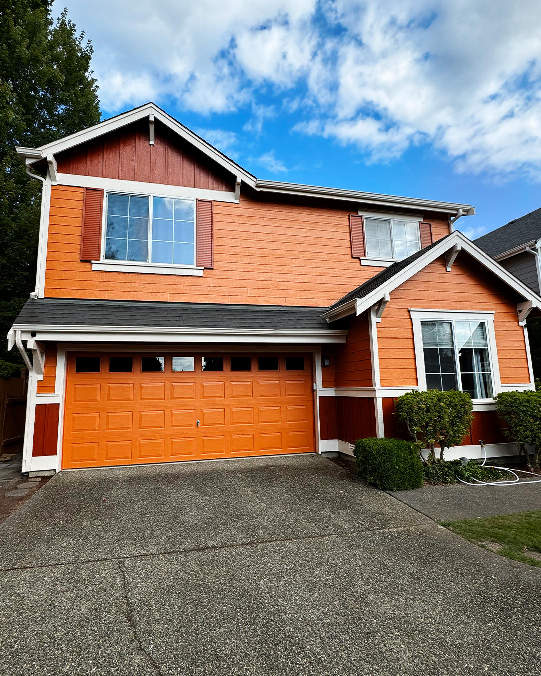 Vibrant exterior renovation that floods this home in an energetic and modern orange, with premium paint expertly applied over siding, garage door, and deep red accents. Every framed window and shutter highlights the chromatic cohesion, flawless texture, and total weather protection. The façade now radiates warmth, personality, and an unforgettable visual impact.