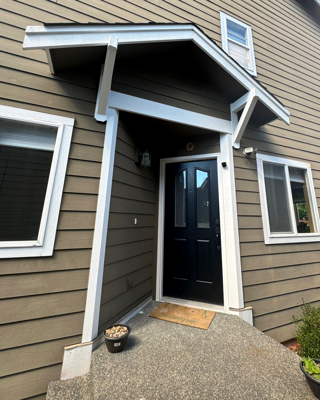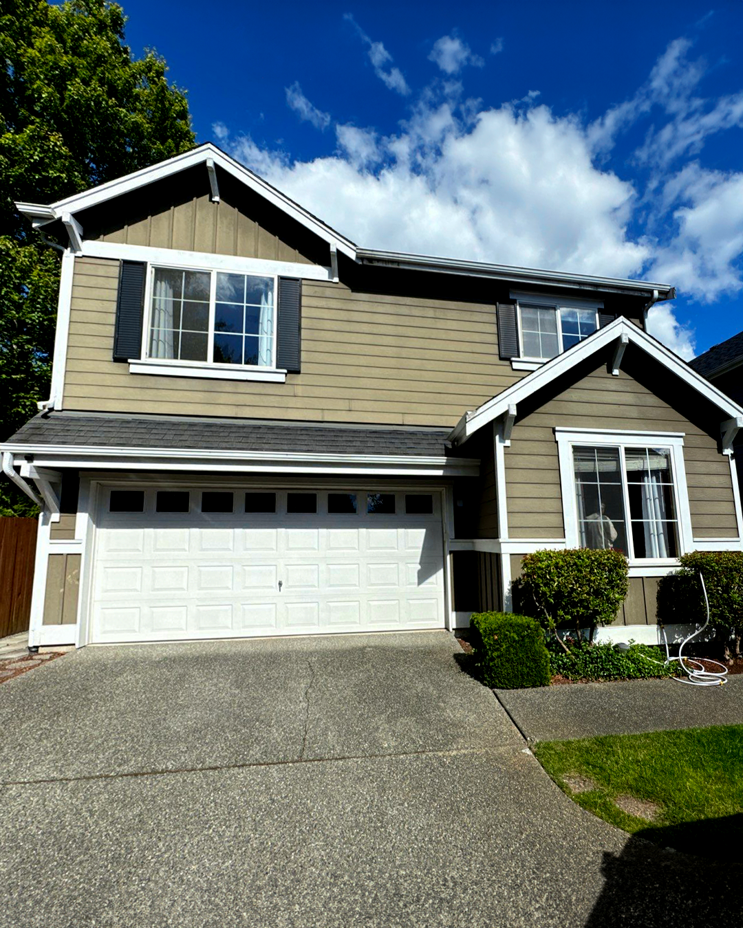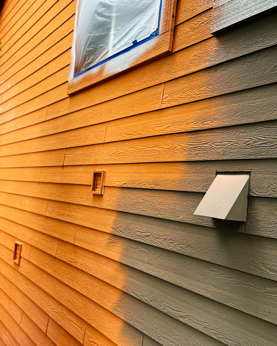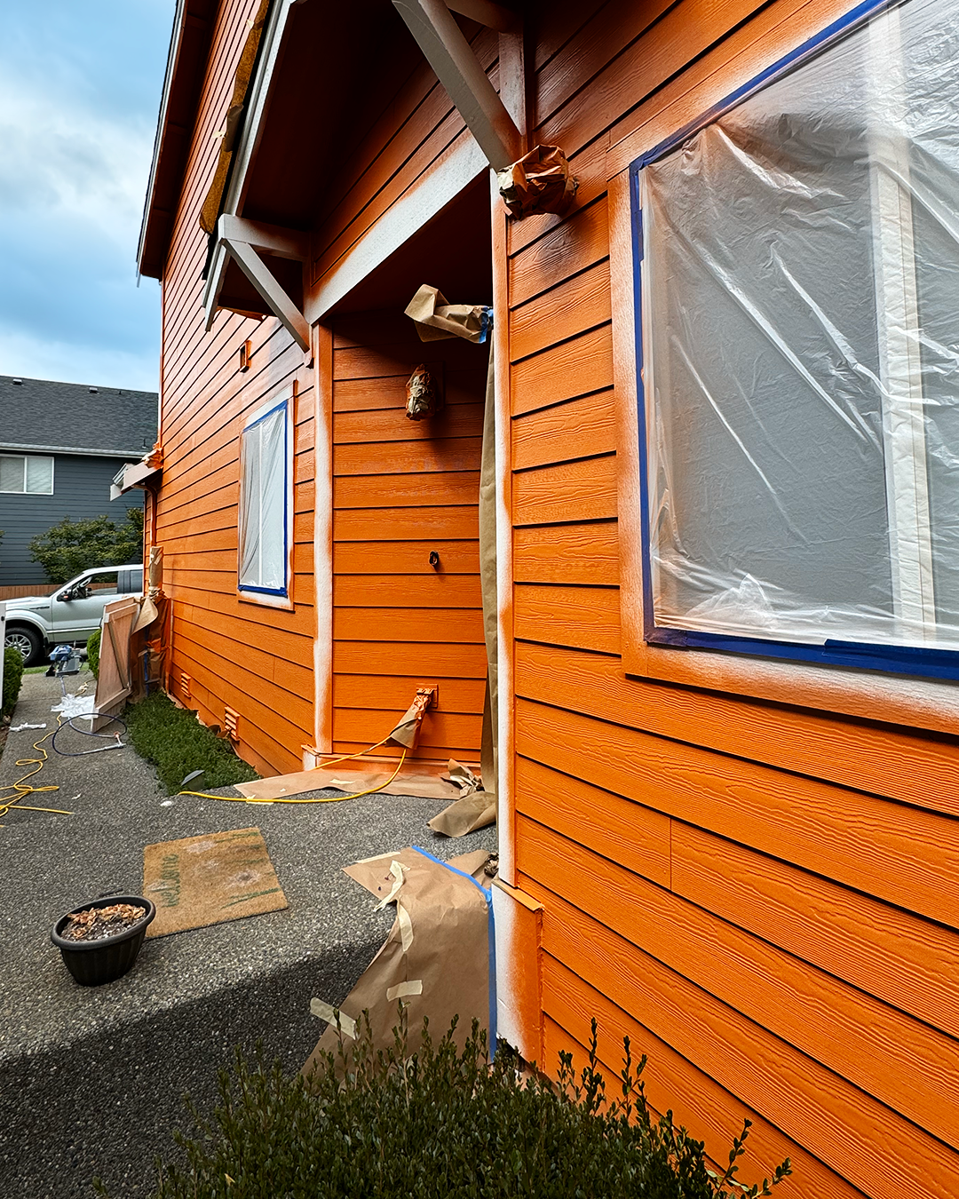 Vibrant exterior renovation that floods this home in an energetic and modern orange, with premium paint expertly applied over siding, garage door, and deep red accents. Every framed window and shutter highlights the chromatic cohesion, flawless texture, and total weather protection. The façade now radiates warmth, personality, and an unforgettable visual impact.